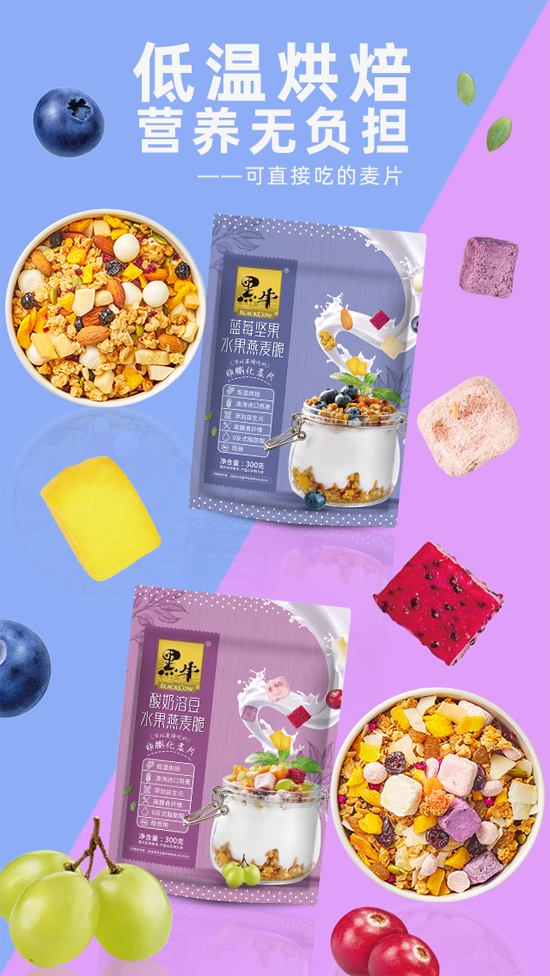 今年,黑牛也抓住了烘焙類麥片快速增長的商機(jī),推出藍(lán)莓堅果水果燕麥脆和酸奶溶豆水果燕麥脆,其采用低溫烘焙(由專利三維低溫烘焙裝置精制而成),是非膨化麥片,可以直接吃的麥片;添加多種水果干、堅果和酸奶塊,0反式脂肪酸和添加益生元,科學(xué)配方,營養(yǎng)均衡無負(fù)擔(dān)。