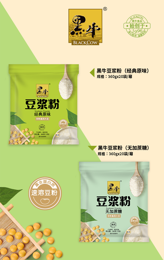 2020年,黑牛加大對餐飲渠道的投入力度,推出了餐飲裝經(jīng)典原味速溶豆?jié){粉,積極擴(kuò)大餐飲渠道市場,打造新的業(yè)績增長點。此次新推的豆?jié){粉原料均選用非轉(zhuǎn)基因大豆加工而成,有全渣與脫渣兩種,脫渣豆?jié){粉采用脫皮、脫渣、脫腥的三脫技術(shù)精加工工藝,很好地還原大豆本來的香味與營養(yǎng),產(chǎn)品更細(xì)膩、更順滑醇香,滿足消費者對精致生活與口味享受的追求。該產(chǎn)品在包裝設(shè)計上也非常有賣點,正面采用透明設(shè)計,讓產(chǎn)品品質(zhì)看得見的同時,為了更好地儲存產(chǎn)品品質(zhì),背面則采用鋁膜材質(zhì)設(shè)計,保證產(chǎn)品在開封之前的新鮮度。