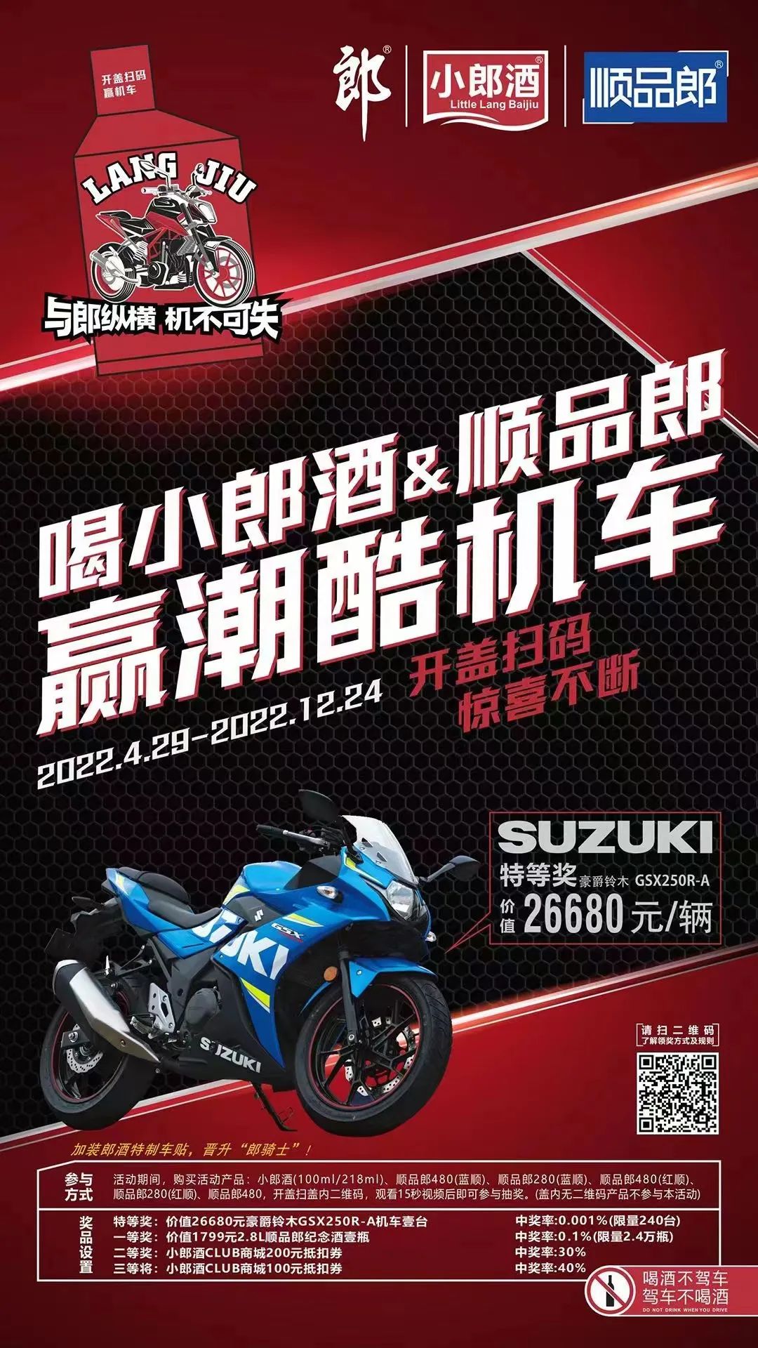 2022年4月29日至12月24日活動(dòng)期間,購(gòu)買小郎酒/順品郎活動(dòng)產(chǎn)品,掃描蓋內(nèi)二維碼(內(nèi)蓋無(wú)二維碼產(chǎn)品不參加本活動(dòng)),即有機(jī)會(huì)贏取價(jià)值26680元的豪爵鈴木機(jī)車,平均每天抽出一輛,更有2.4萬(wàn)瓶2.8L順品郎紀(jì)念酒及小郎酒CLUB 200元抵扣券(中獎(jiǎng)率30%)、100元抵扣券(中獎(jiǎng)率40%)等你贏取。