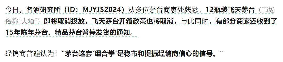 據(jù)“名酒研究所”文章:從多位茅臺(tái)商家處獲悉,12瓶裝飛天茅臺(tái)(市場(chǎng)俗稱(chēng)“大箱”)即將取消投放,飛天茅臺(tái)開(kāi)箱政策也將取消,與此同時(shí),有部分商家還收到了15年陳年茅臺(tái)、精品茅臺(tái)暫停發(fā)貨的通知。