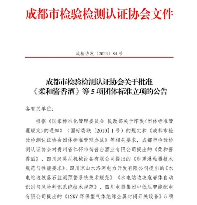 近日,成都市檢驗檢測認證協(xié)會發(fā)布公告,根據(jù)相關(guān)要求,協(xié)會對《柔和醬香酒》等5項團體標準進行立項評審。經(jīng)評審,該5項團體標準符合立項條件批準立項。
