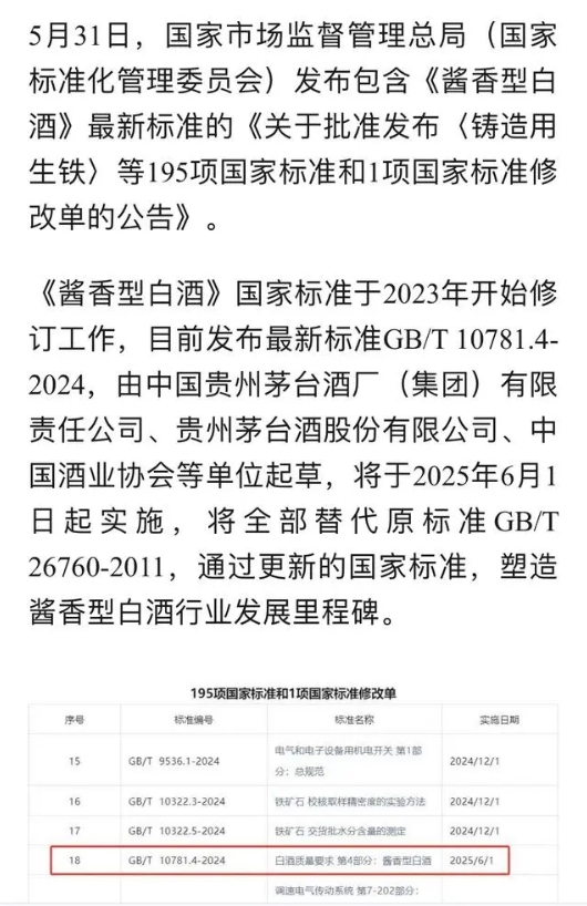 據(jù)悉,目前關(guān)于醬酒標準已發(fā)布的團體標準有:“清雅醬香”“柔和醬香”“醇柔醬香”“赤水河醬香”“徽派醬香”“北派醬香”等。醬香白酒國家標準新修訂版已發(fā)布,將于2025年6月1日實施。