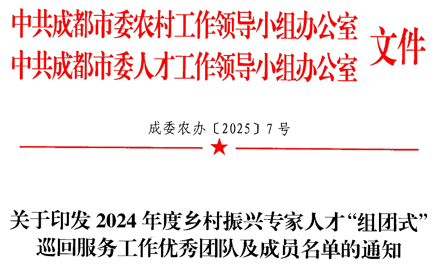 在2025年中央一號(hào)文件發(fā)布的前夕,2月17日,中共成都市委農(nóng)村工作領(lǐng)導(dǎo)小組辦公室、中共成都市委人才工作領(lǐng)導(dǎo)小組辦公室聯(lián)合下發(fā)文件《關(guān)于印發(fā)2024年度鄉(xiāng)村振興專家人才“組團(tuán)式”巡回服務(wù)工作優(yōu)秀團(tuán)隊(duì)及成員名單的通知》(成委農(nóng)辦[2025]7號(hào));成都大學(xué)劉達(dá)玉教授(龍泉團(tuán))、王新惠教授(雙流團(tuán))帶領(lǐng)的農(nóng)業(yè)專家服務(wù)團(tuán),分別榮獲2024年度鄉(xiāng)村振興專家人才“組團(tuán)式巡回服務(wù)工作優(yōu)秀團(tuán)隊(duì)”稱號(hào)。2024年,成都市創(chuàng)新實(shí)施鄉(xiāng)村振興專家人才“組團(tuán)式”巡回服務(wù)工作,探索“綜合服務(wù)團(tuán)+專項(xiàng)服務(wù)團(tuán)+本地服務(wù)團(tuán)”三級(jí)聯(lián)動(dòng)模式,構(gòu)建形成“5+8+N”巡回服務(wù)體系;全市鄉(xiāng)村振興專家人才“組團(tuán)式”巡回服務(wù)工作動(dòng)員部署后,成都大學(xué)專家在學(xué)校領(lǐng)導(dǎo)、龍泉驛和雙流農(nóng)業(yè)農(nóng)村局領(lǐng)導(dǎo)的支持下,迅速組建團(tuán)隊(duì),聯(lián)合全市農(nóng)業(yè)產(chǎn)業(yè)鏈相關(guān)專家、當(dāng)?shù)鼗鶎愚r(nóng)業(yè)專家,研究制定了龍泉驛區(qū)、雙流區(qū)的鄉(xiāng)村振興細(xì)化工作方案。