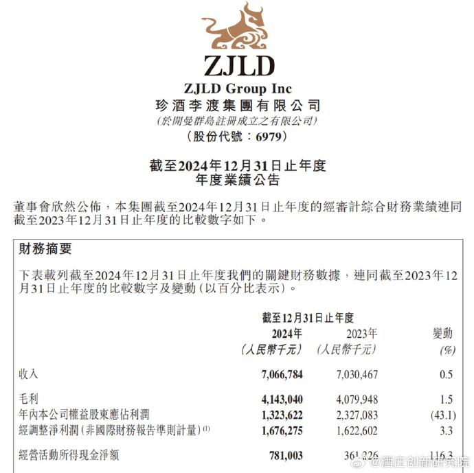3月20日晚間,珍酒李渡(06979.HK)發(fā)布2024年業(yè)績(jī)公告。報(bào)告期內(nèi)公司實(shí)現(xiàn)收入70.7億元,同比增長(zhǎng)0.5%;經(jīng)調(diào)整凈利潤(rùn)16.8億元,同比增長(zhǎng)3.3%。主要指標(biāo)連續(xù)四年保持增長(zhǎng)。