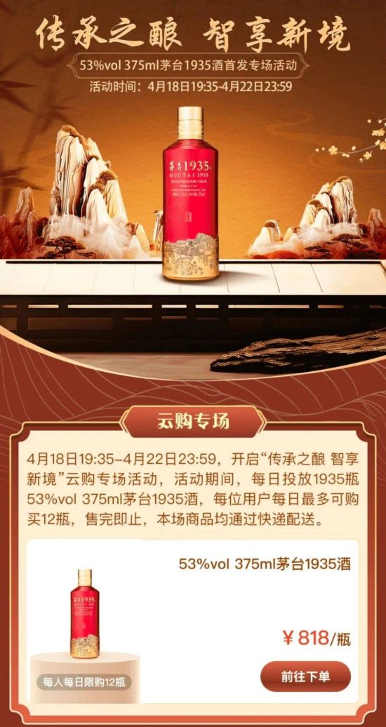 據(jù)i茅臺官微消息,4月18日19時35分,53%vol 375ml茅臺1935在i茅臺首發(fā),價格為818元 /瓶,每日限量投放1935瓶,每位用戶每日限購12瓶。
