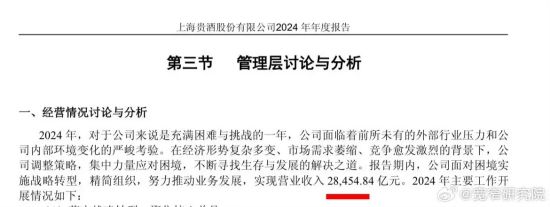 另外一個(gè)被特別關(guān)注的是,2024年度報(bào)告第三節(jié)的“管理層討論與分析”章節(jié),上海貴酒稱:“報(bào)告期內(nèi),公司面對(duì)困境實(shí) 施戰(zhàn)略轉(zhuǎn)型,精簡(jiǎn)組織,努力推動(dòng)業(yè)務(wù)發(fā)展,實(shí)現(xiàn)營(yíng)業(yè)收入28,454.84億元。”,第二節(jié)的營(yíng)收顯示的是284,548,362.07元。標(biāo)注單位不一致,可謂是天差地別。也可能是“不小心”,但是,這樣的錯(cuò)誤對(duì)于專業(yè)財(cái)務(wù)人員而言無(wú)疑是致命錯(cuò)誤。上市公司報(bào)表是多么嚴(yán)謹(jǐn)?shù)氖虑?,出現(xiàn)如此重大數(shù)字書寫錯(cuò)誤,實(shí)屬不該。也暴露出企業(yè)內(nèi)部管理漏洞與經(jīng)營(yíng)風(fēng)險(xiǎn)存在。國(guó)酒研究所、酒莊頭條