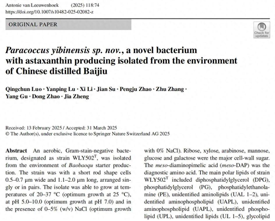 據(jù)?五糧液?消息?,近日,五糧液微生物研究團(tuán)隊(duì)首次在釀酒環(huán)境中分離出一株具有產(chǎn)蝦青素能力的全新菌種,菌種代號(hào)WLY502(簡稱502菌),以首次發(fā)現(xiàn)地“宜賓”命名為宜賓副球菌(Paracoccus yibinensis)。新菌種的研究論文《Paracoccus yibinensis sp. nov., a novel bacterium with astaxanthin producing isolated from the environment of Chinese distilled Baijiu》(分離自中國白酒釀造環(huán)境中產(chǎn)蝦青素的宜賓副球菌新菌種)已在國際微生物分類學(xué)知名雜志《Antonie Van Leeuwenhoek》全球公開發(fā)表(全文鏈接點(diǎn)擊文末閱讀原文查看)。