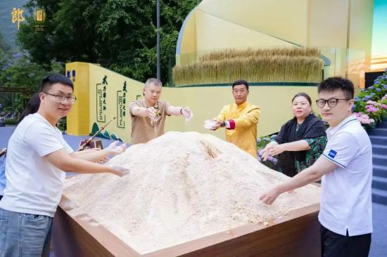 △郎酒股份副總工程師、醬香型酒總工程師鄧皖玉(左三)與嘉賓一同體驗(yàn)拌曲工藝