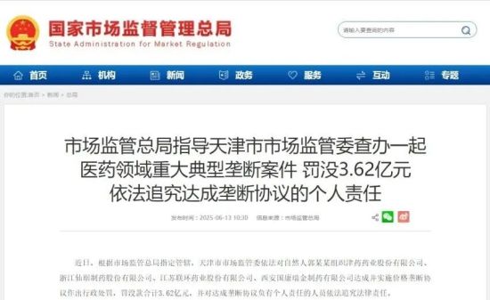 6月13日消息,根據(jù)市場監(jiān)管總局指定管轄,天津市市場監(jiān)管委近日依法對自然人郭某某組織津藥藥業(yè)股份有限公司、浙江仙琚制藥股份有限公司、江蘇聯(lián)環(huán)藥業(yè)股份有限公司、西安國康瑞金制藥有限公司達(dá)成并實施價格壟斷協(xié)議作出行政處罰,罰沒款合計3.62億元,并對達(dá)成壟斷協(xié)議負(fù)有個人責(zé)任的人員依法追究法律責(zé)任。