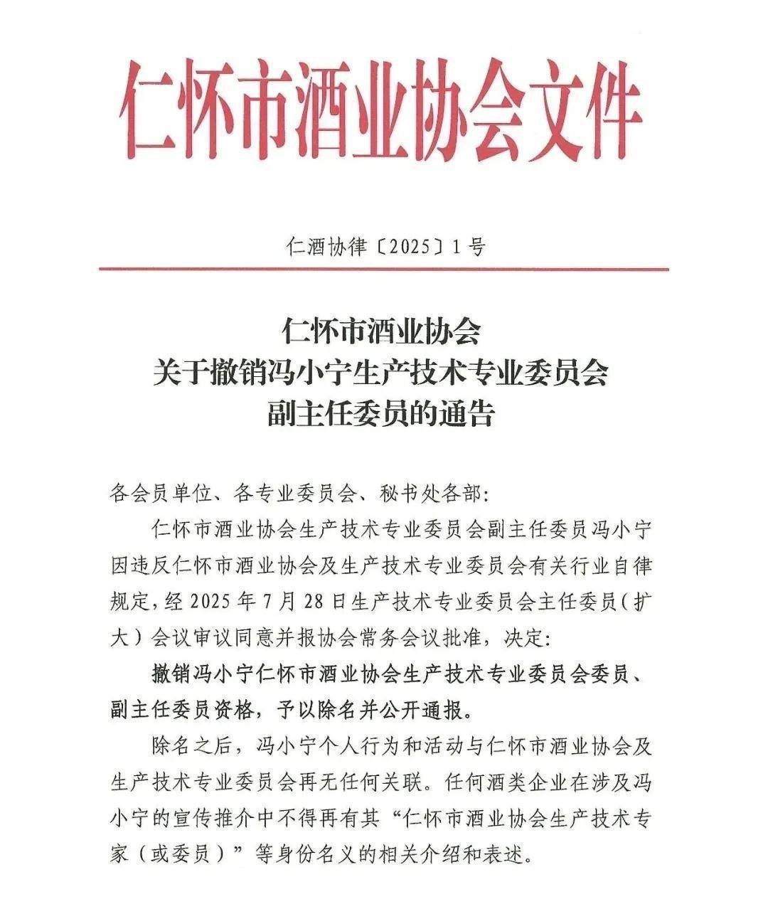 通告中顯示,仁懷市酒業(yè)協(xié)會生產(chǎn)技術(shù)專業(yè)委員會副主任委員馮小寧因違反仁懷市酒業(yè)協(xié)會及生產(chǎn)技術(shù)專業(yè)委員會有關(guān)行業(yè)自律規(guī)定,經(jīng)2025年7月28日生產(chǎn)技術(shù)專業(yè)委員會主任委員(擴大)會議審議同意并報協(xié)會常務(wù)會議批準,決定:撤銷馮小寧仁懷市酒業(yè)協(xié)會生產(chǎn)技術(shù)專業(yè)委員會委員、副主任委員資格,予以除名并公開通報。