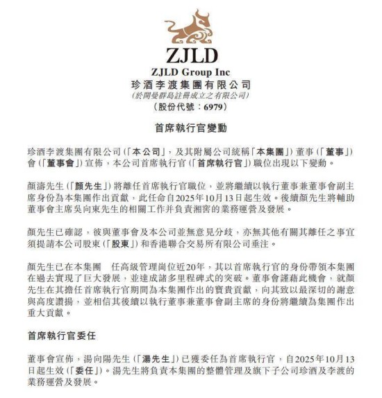 10月13日,珍酒李渡集團(6979.HK)發(fā)布高管任命公告:湯向陽任集團首席執(zhí)行官,顏濤任集團執(zhí)行董事兼董事會副主席,兩項任命即日生效。
