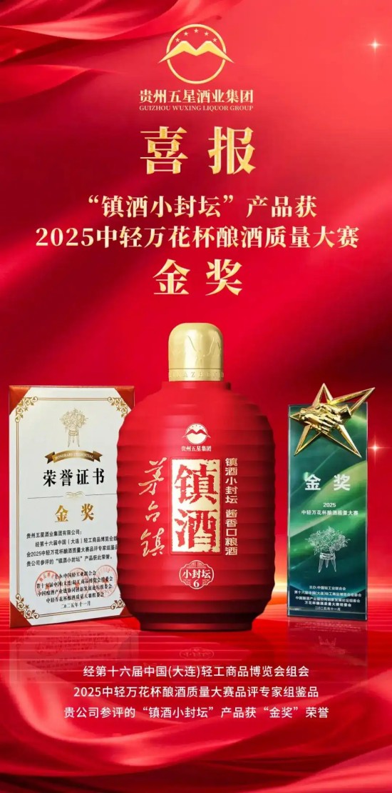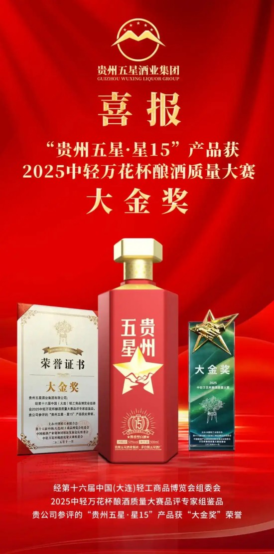 在本屆博覽會(huì)首次舉辦的2025中輕萬花杯釀酒質(zhì)量大賽中,貴州五星酒業(yè)集團(tuán)有限公司旗下產(chǎn)品“貴州五星?星15”、“鎮(zhèn)酒小封壇”憑借卓越品質(zhì)與厚重文化,分別斬獲“大金獎(jiǎng)”“金獎(jiǎng)”兩大獎(jiǎng)項(xiàng)。