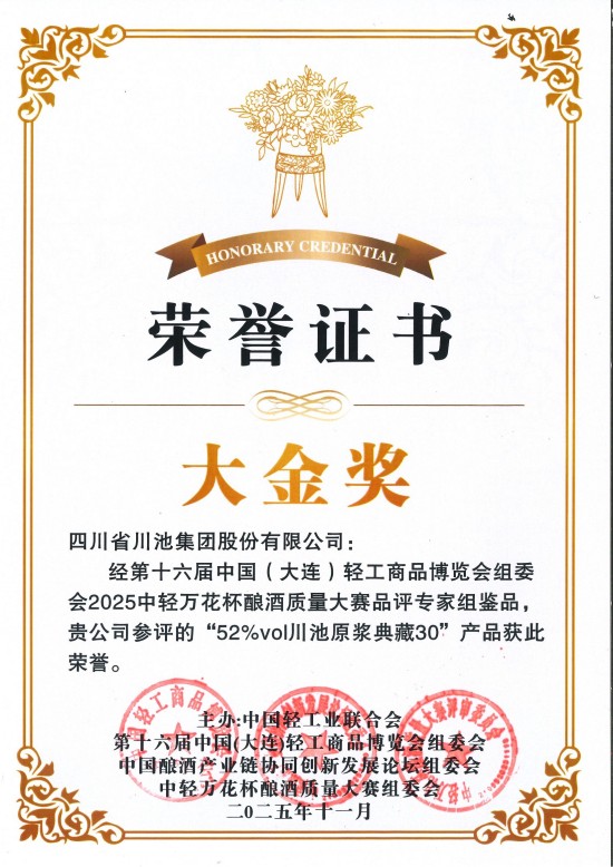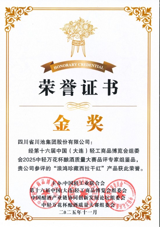 在本屆博覽會首次舉辦的2025中輕萬花杯釀酒質(zhì)量大賽中,四川省川池集團股份有限公司旗下產(chǎn)品“川池原漿典藏30”“浪鴻珍藏西拉干紅”憑借卓越品質(zhì)和深厚文化,分別斬獲“大金獎”“金獎”兩大重磅獎項。