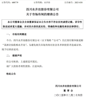 12月25日,多家媒體報道稱,劍南春將收購水井坊,關(guān)于此傳聞,當(dāng)日晚間水井坊發(fā)布《水井坊關(guān)于市場傳聞的澄清公告》。
