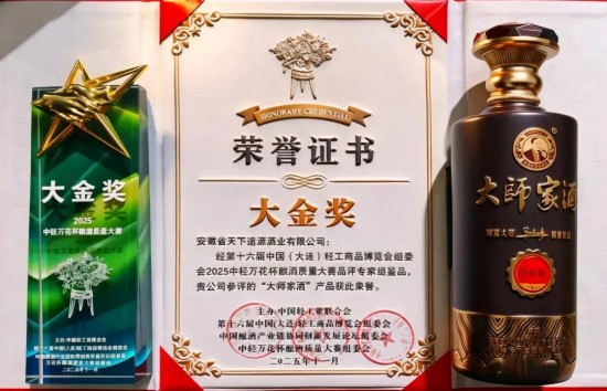 在本屆博覽會舉辦的2025中輕萬花杯釀酒質(zhì)量大賽中,安徽省天下道源酒業(yè)有限公司產(chǎn)品“大師家酒”憑借卓越品質(zhì)和深厚文化,斬獲“大金獎”。
