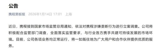 攜程表示,將積極配合監(jiān)管部門調(diào)查,全面落實(shí)監(jiān)管要求,與行業(yè)各方攜手共建可持續(xù)發(fā)展的市場(chǎng)環(huán)境。