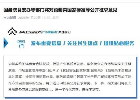 據(jù)市場(chǎng)監(jiān)管總局消息,為切實(shí)維護(hù)消費(fèi)者合法權(quán)益,促進(jìn)產(chǎn)業(yè)高質(zhì)量發(fā)展,國務(wù)院食安辦組織國家衛(wèi)生健康委、市場(chǎng)監(jiān)管總局等部門起草了《食品安全國家標(biāo)準(zhǔn) 預(yù)制菜》《預(yù)制菜術(shù)語和分類》草案;會(huì)同市場(chǎng)監(jiān)管總局、商務(wù)部等部門起草了關(guān)于推廣餐飲環(huán)節(jié)菜品加工制作方式自主明示的公告,將于近日向社會(huì)公開征求意見。下一步,相關(guān)部門將在充分吸納各方意見建議的基礎(chǔ)上,進(jìn)一步修改完善,按程序發(fā)布。